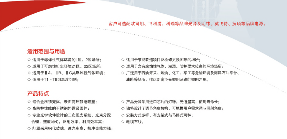 公司致力于成为绿色、环保、节能的工业照明解决方案的提供商,为油田、石化、电力、冶金、铁路、航天、部队、公安、消防、场馆、道路、工厂等提供优质的照明产品及专注的技术服务方案。
